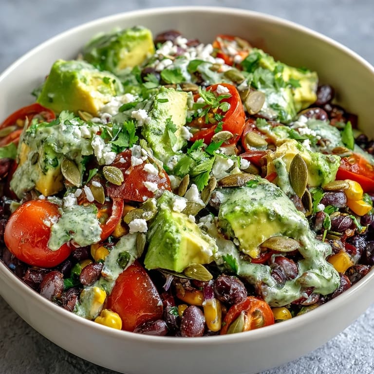Save A vibrant, nourishing bowl featuring black beans, sweet corn, juicy tomatoes, creamy avocado, and fresh cilantro, all brought together with a zesty lime dressing. Perfect for a healthy, satisfying meal that captures the essence of fresh, Mexican-inspired flavors without any cooking required.