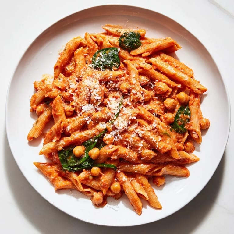 Save My neighbor Maria handed me a basket of cherry tomatoes one August afternoon, still warm from her garden. I had chickpeas in the pantry and a craving for something creamy but not heavy. That's when this pasta happened, almost by accident, with spinach wilting into a sauce that turned golden from the cream and Parmesan. The kitchen smelled like garlic and summer, and I've been making it ever since.