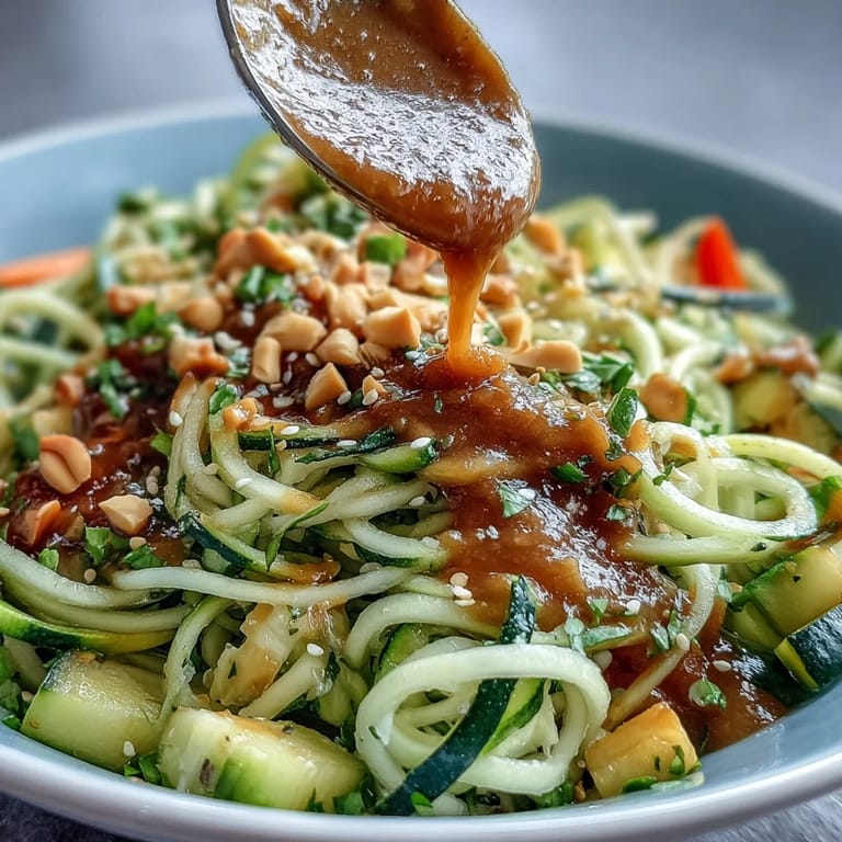 This stir-fry celebrates the natural crispness of fresh vegetables paired with an easy-to-make peanut sauce that is creamy, tangy, and slightly sweet. It’s a refreshing twist on traditional noodle dishes using zucchini as a low-carb alternative that complements the Asian-inspired flavors perfectly.