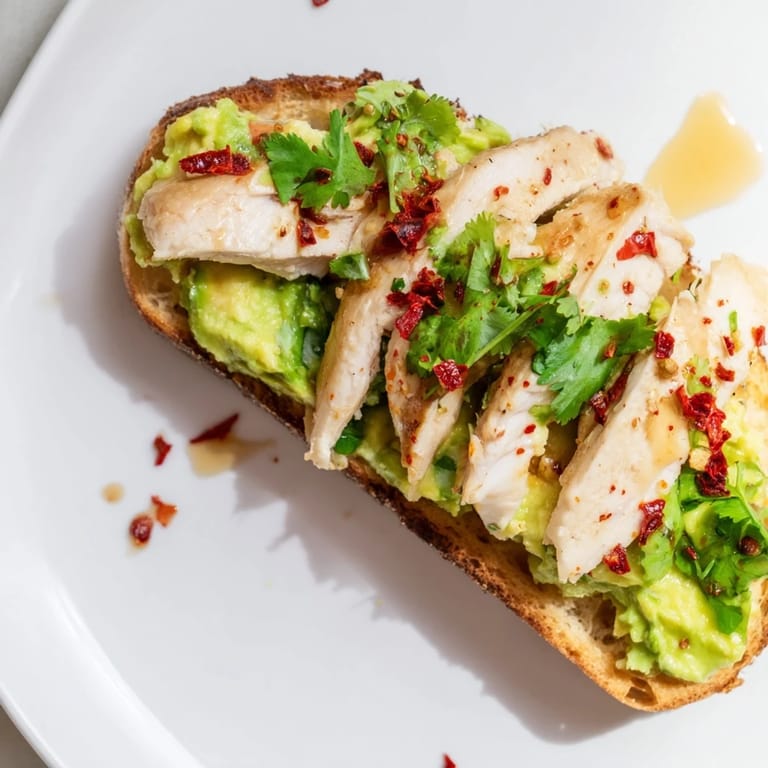 - Spread the smashed avocado generously over each piece of toast, then layer the sliced grilled chicken on top. Sprinkle with chili flakes, drizzle honey in a zigzag, and finish with fresh herbs if using.